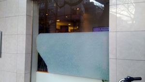 ガラスフィルム剥がし作業 店舗撤去によりフィルムを剥がしました。このようなシートの剥がし作業は、ガラスを傷つける恐れがあるため、弊社にご依頼ください。 このような剥がしのみの施工もお受けしています